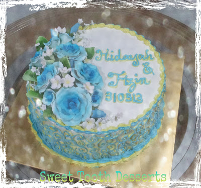 I spent the whole day completing this order. A returning customer ordered this hantaran cake for his cousin's engagement. He requested for blue n yellow themed cake.. Thus, I made this blue n yellow 'rainbow' cake, layered n topped with cream cheese frosting.. Thanks for ordering..